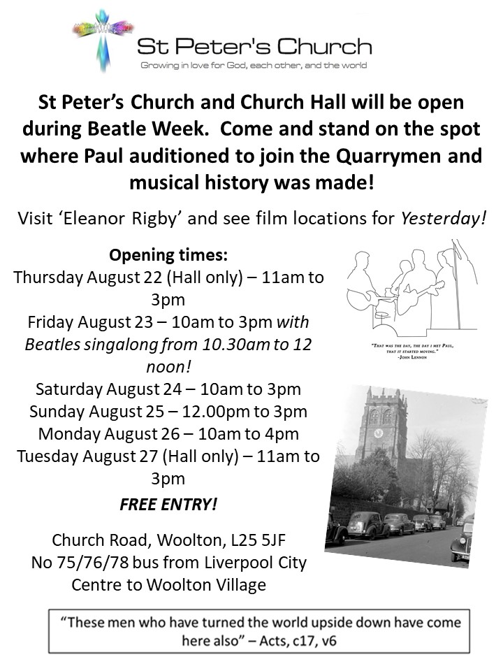 We can’t wait to start welcoming visitors to St Peter’s Church and Church Hall from tomorrow for International Beatle Week, 2019!