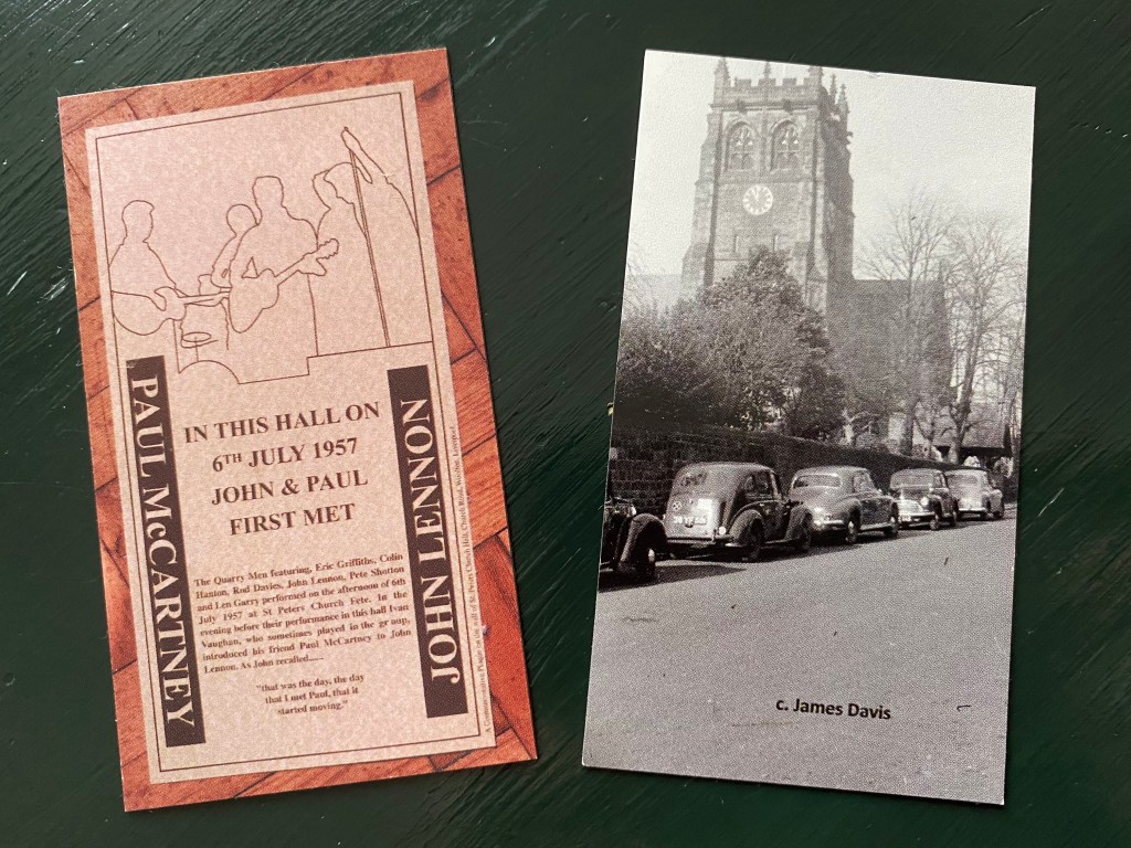 We have two different designs available: one is an image of the commemorative plaque on the Church Hall, celebrating the day that John Lennon met Paul McCartney at St Peter’s; the other shows the Church in 1957.