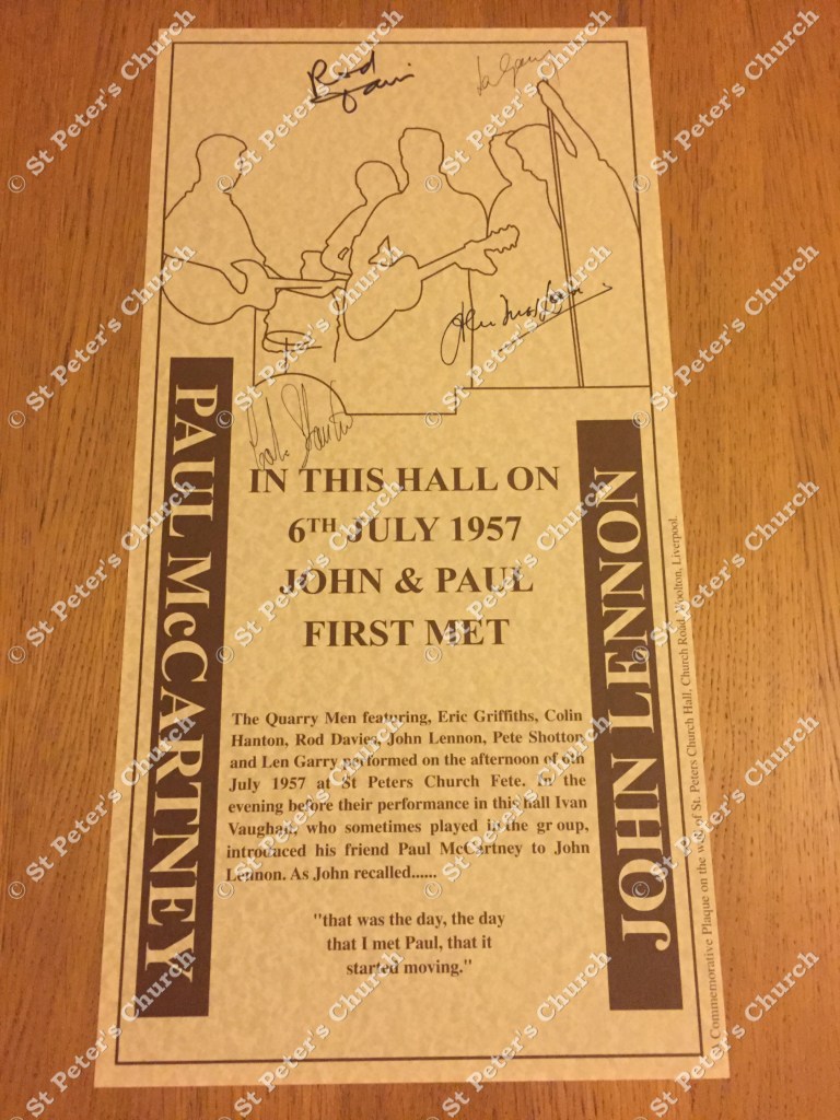 We also have lovely St Peter’s branded candles, hymn books that were used in the Church during the 1950s, and our full range of exclusive merchandise celebrating the day that John met Paul in the Church Hall on July 6, 1957 including a LIMITED number of posters signed by Colin Hanton of the Quarrymen!