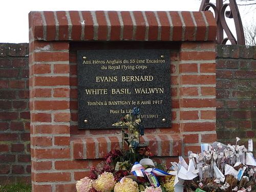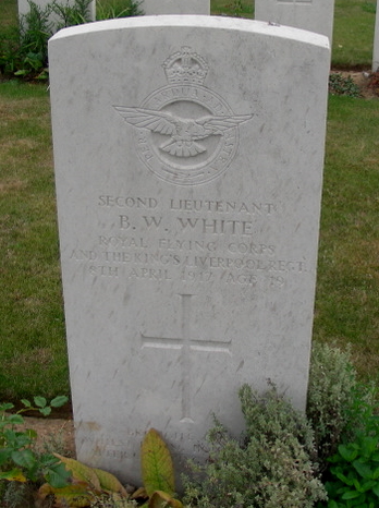 Second Lieutenant Basil Walwyn White aged 19 died 8th April 1917 of the 55th Squadron observer and gunner on a DH4 plane serial number A2141. With Lieutenant Bernard Evans was shot down while on a bombing raid on a Chateau at Hardenpont near Mons France. They where shot down over Blecourt by Leutnant Kurt Wolff, both men where killed .