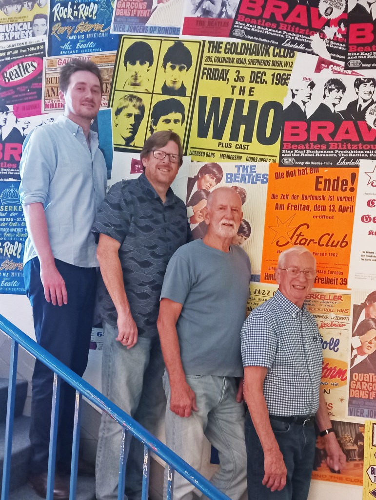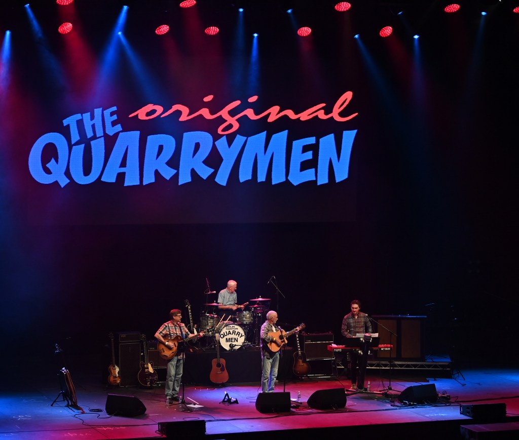 The current Quarrymen lineup consists of Colin Hanton on drums – who played with John, Paul and George – Rod Davis now on guitar, banjo player in the Quarrymen on the day John met Paul, plus Henry Duff Lowe on keyboards – the son of John Duff Lowe who played piano on the 1958 recording of “In Spite of all the Danger” and David Bedford, Liverpool Beatles’ author, on bass.