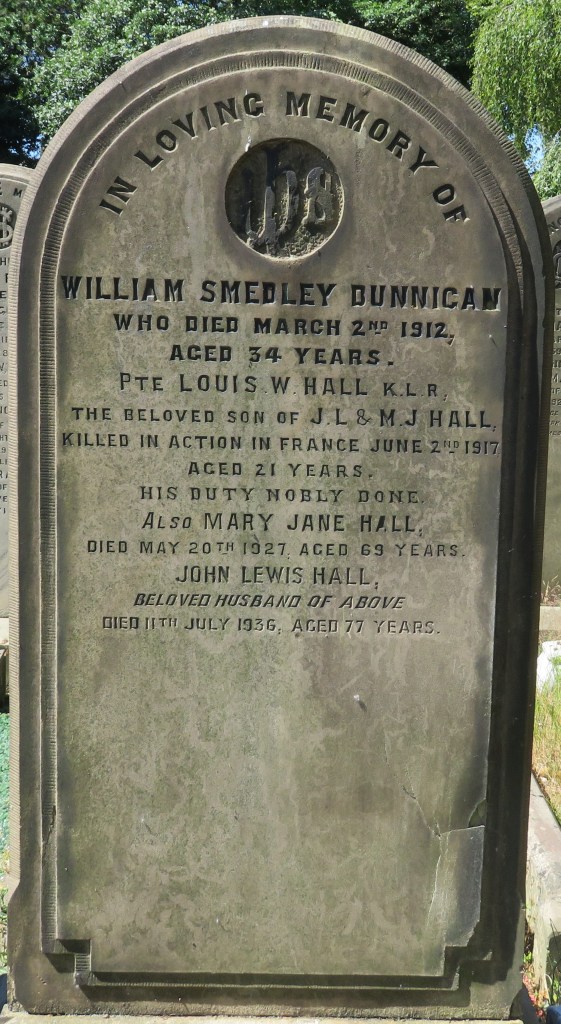 Private Louis Wyckliffe Hall born 4th July 1895 (and baptized 25th October 1903 St Hilda’s Hunts Cross mission church to St Peters Woolton and family living in Macketts Lane )