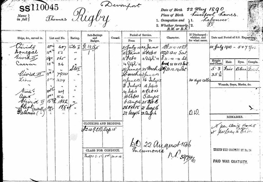 From local newspaper Thomas Rigby has died from pneumonia on HMS Dolhousie. The deceased sailor was 28 years old and had been in the Navy 6 years And for the last 10 months had been on the River Tigris Mesopotamia . His mother living at 18 Rodick St Woolton Woolton. a bother Private D Rigby serving in K L R.